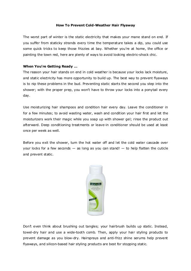 The reason your hair stands on end in cold weather is because your locks lack moisture, and static electricity has more opportunity to build up. The best way to prevent flyaways is to nip these problems in the bud. Preventing static starts the second you step into the shower; with the proper prep, you won't have to throw your locks into a ponytail every day.
